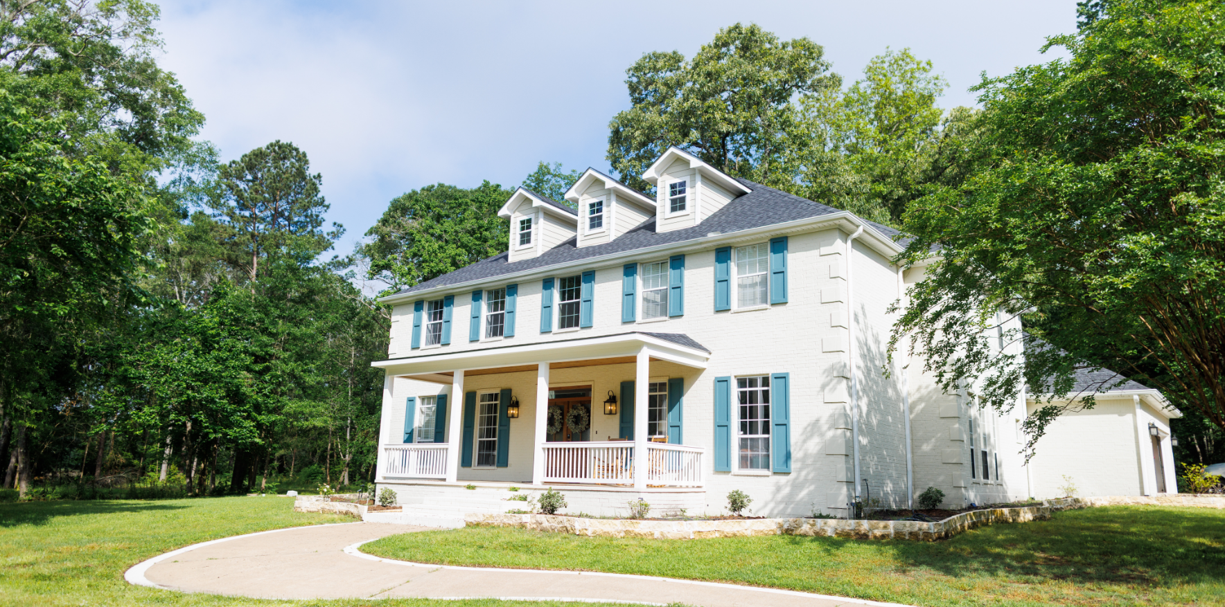 We reimagined the exterior, transitioning it into a warm French country farmhouse. The transformation began by removing the imposing two-story columns and replacing them with a wide, single-story front porch—more inviting and family-friendly. A new stained double front door, stained tongue-and-groove pine ceiling, shutters, and matching windows across the front created balance and charm. Fresh paint and soft, stone-lined flower beds added to the welcoming curb appeal. To give the house a true farmhouse feel, we designed and added three front dormers, bringing both character and natural light.